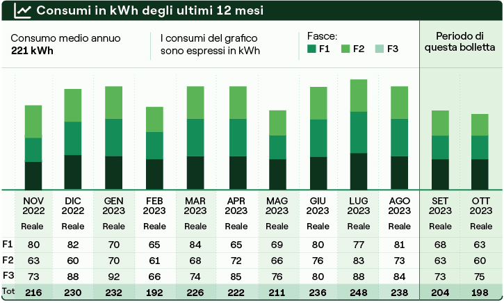 Consumi e costi energetici mensili riferiti all'intera annualità più recente (da gennaio a dicembre), sono solitamente reperibili dalla prima fattura dell’anno successivo a quello di cui interessa trasmettere i dati. Esempio: su fattura gennaio 2024 si trovano i consumi relativi a tutti i mesi dell’anno 2023 - vedi figura per i consumi su 12 mesi consecutivi.
