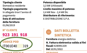Il POD (Punto di prelievo – Numero di presa del contatore di energia elettrica), è il codice (di 14 o 15 caratteri che inizia con IT00...), che serve ad individuare con precisione l'utenza elettrica, reperibile nella bolletta elettrica nella parte contenente le informazioni contrattuali di fornitura.